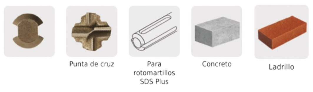 – Punta de cruz, tecnología con doble inserto de carburo para mayor precisión de perforación, 2x mayor durabilidad que las brocas convencionales