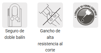 – Cuerpo de hierro en una sola pieza con acabado pulido y gancho de acero acabado cromado