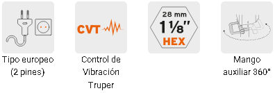 – Empuñaduras con sistema de Control de Vibración Truper (CVT) que reduce las vibraciones, haciendo el trabajo más confortable y seguro para el operador