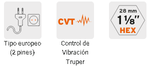 – Empuñaduras con sistema de Control de Vibración Truper (CVT) que reduce las vibraciones, haciendo el trabajo más confortable y seguro para el operador