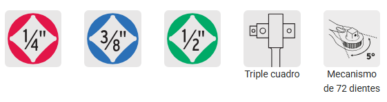 – Mecanismo de acero al cromo vanadio de 72 dientes, que permite apretar o aflojar con un movimiento mínimo en áreas estrechas